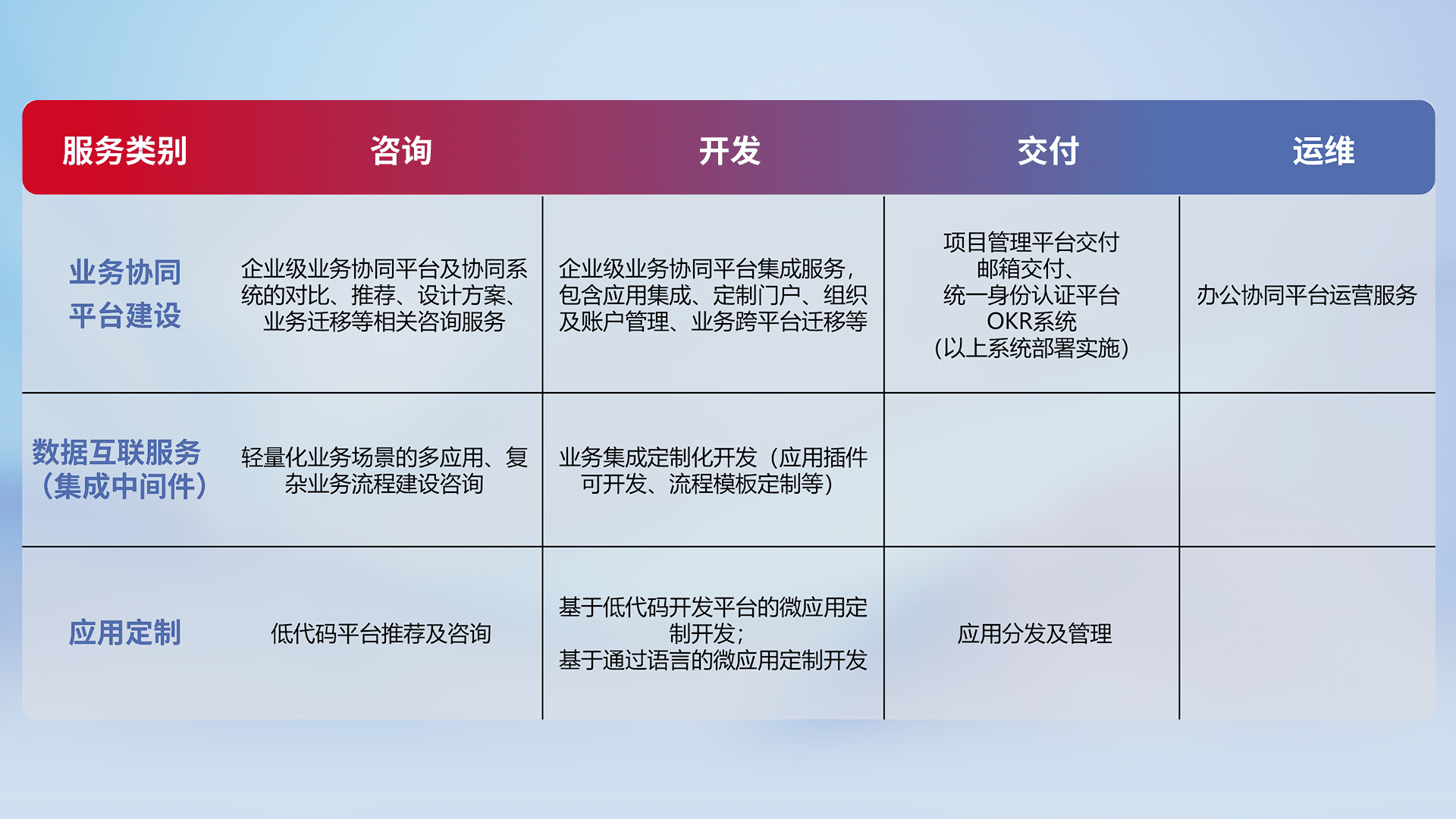 针对钉钉、、、、企微、、IDaas等平台级产品提供产品的规划、、、、方案、、、、交付、、、定制化开发等服务,,实现如统一协同办公、、、智能客户服务、、、、混合会议管理、、智能数据查询、、、等业务场景,,,,实现数字化转型。。