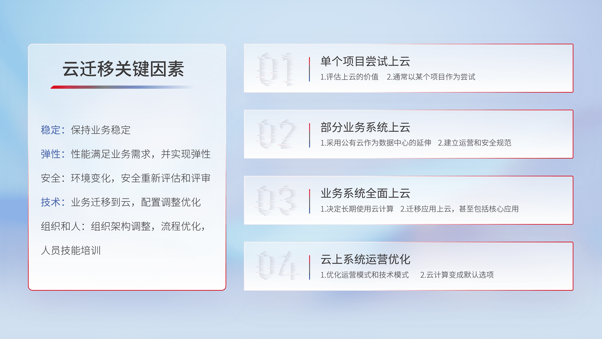 结合实际业务,,,从规划设计、、、云平台选型、、、云原生改造、、、数据迁移、、、、集成交付,,迁移全过程为客户识别最佳上云路径,,,做好风险识别管理,,,设计网络架构、、身份权限、、安全审计合规、、、操作审计、、、、日志审计、、、监控告警策略、、、、多站点容灾设计等,,对云上基础设施进行整体规划,,,提升IT治理水平,,以满足弹性、、、、高可用、、、、高性能的需求。。