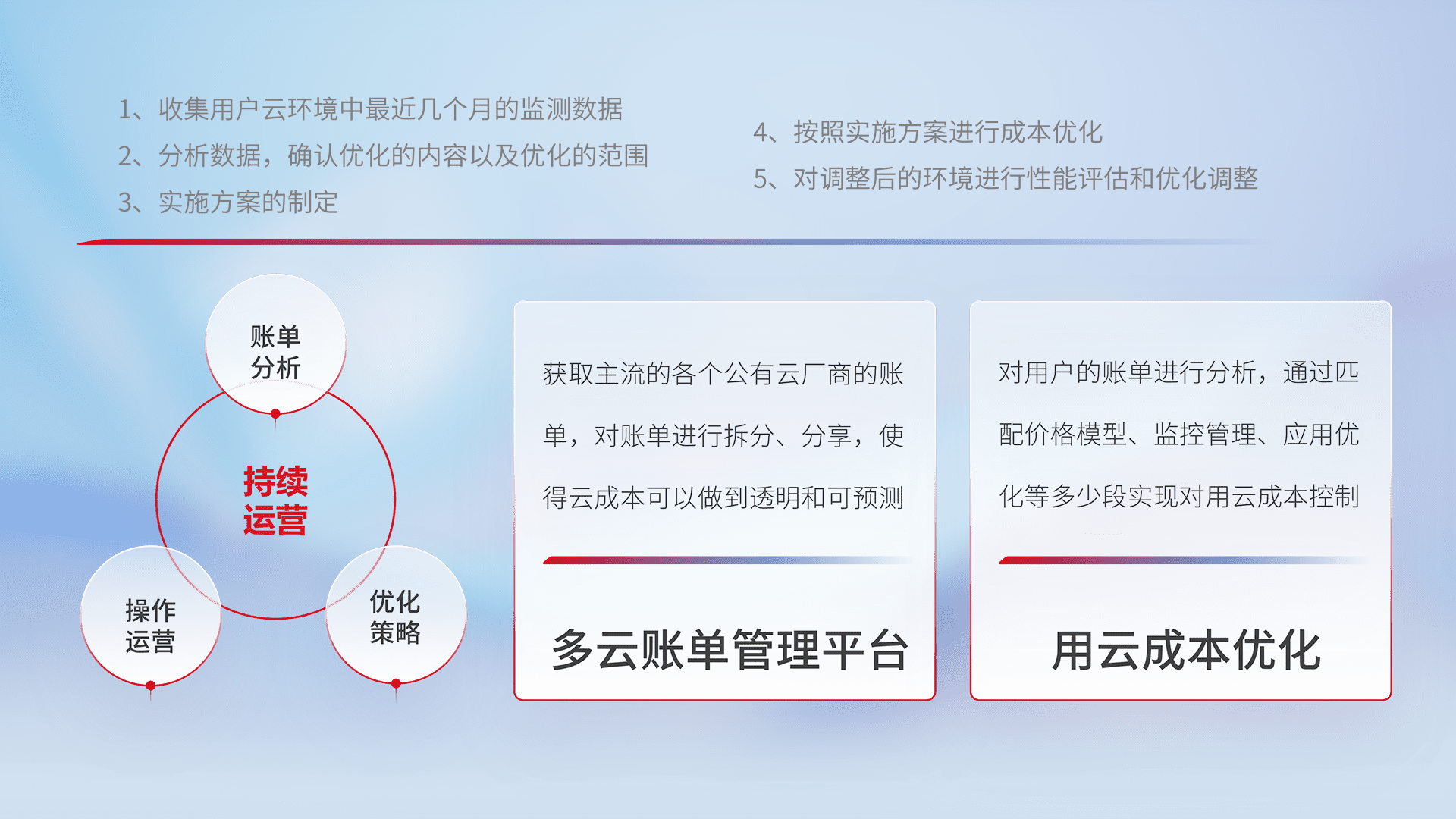 通过多云纳管,,,以统一的资源数据模型把客户的云资源进行抽象和封装,,进而实现对多云资源的统一操作,,保障云资源管理的可靠性、、、、稳定性与可用性。。。。量身定制化运维内容,,,,配置、、、开发运维、、、、补丁管理、、、备份、、、、监控、、、、认证和访问管理、、审计和日常巡检等,,保障在用云过程中的可靠度,,,稳定度以及高可用率。。。