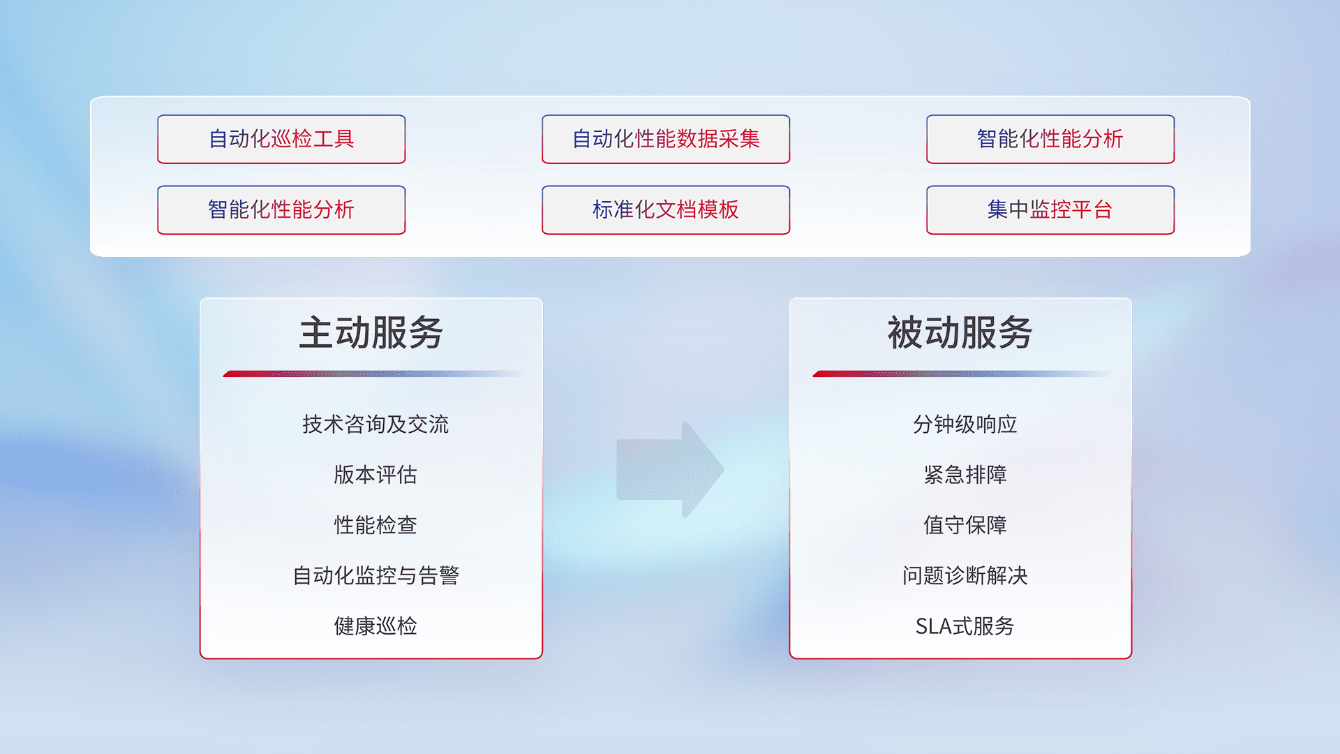 智能化工具和标准化文档,,,保障服务质量,,,提供主动服务(包含技术咨询、、、、版本评估、、、、性能检查、、自动化监控与告警、、、、健康巡检)和被动服务包含(分钟级响应、、、、紧急排障、、、值守保障、、、、问题诊断解决、、SLA服务)。。。